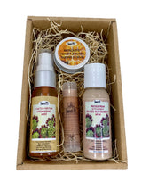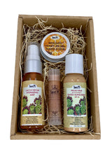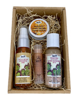 Mesquite Honey Brown Sugar Scrub helps remove dry skin as it moisturizes. Spray Cactus Nectar Mist to tone, plump & protect. Caffeine Under Eye Concealer reduces puffiness & dark circles. Prickly Pear Tinted Sunscreen SPF30 moisturizes & protects in antioxidant rich prickly pear juice formula. Directions included in kraft 4" X 6" X 2" slide box with grosgrain ribbon.